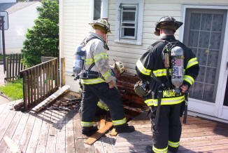 On Sunday morning May 28th the Lynbrook Fire Department responded to a house fire at 23 Alice Court off of Hempstead Avenue. Fire Chief Keith Festa upon his arrival broadcast a heavy smoke condition coming from the rear of the house. It was determined that part of the rear porch and siding of the house was on fire. With a one line hose attack from Engine Company #1, and overhall by Truck Company, the fire was put out in minutes. All other companies stood-by. The fire did not extend into the home. The fire was blamed on a cigarette that had been discarded in a planter on the rear deck of the home. |