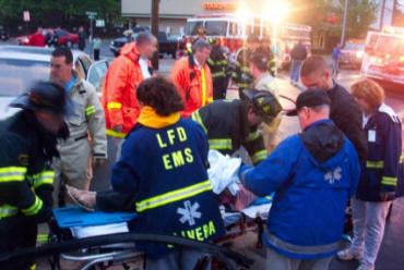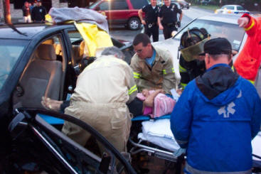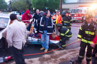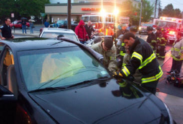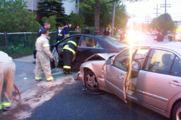 Photos and Story by Ex-Captain Steve Grogan On Wednesday, May 4, 2006, at about 7:30 PM, the Lynbrook Fire Department was dispatched to a reported auto accident at the intersection of Broadway and Olive Place. The department, under the command of Chief Keith Festa, responded with an ambulance from the Emergency Medical Company, and the Extrication Team, as it was reported to be “a tool job”. The Chief also requested Engine Company #1 to the scene to assist. With the Extrication Team working to free one of the driver’s from her vehicle with the Jaws of Life, the members of Medical Company stabilized the injured driver inside the vehicle. The Medical Company team also attended to the driver’s child and mother who were also in the car, as well as to the second driver. The second driver was transported to the hospital by Hewlett FD’s ambulance which came on a mutual aid request while. Lynbrook’s ambulance took the other three to the hospital. |