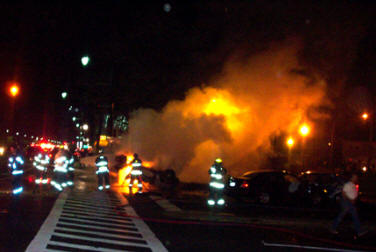 car on fire, at the intersection of Peninsula Blvd and Sunrise Highway.