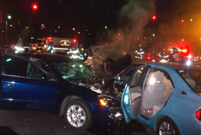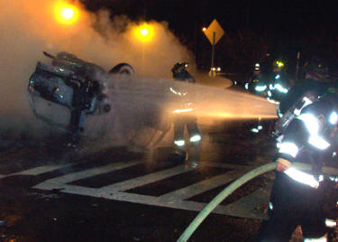 pouring out all over the roadway from the ruptured gas tank. The driver