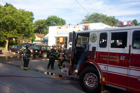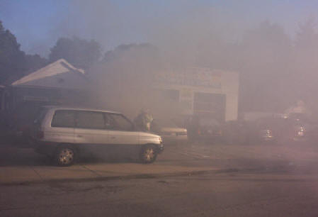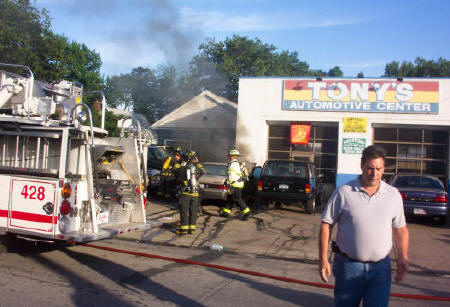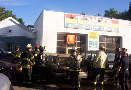 Shortly before 7 pm on June 23rd, 2005, Lynbrook Firefighters were summoned to a working car fire at Tony's Automotive on Hendrickson Ave. The first arriving police unit advised the dispatcher that there was a working car fire directly adjacent to the repair facility and requested a General Alarm be sounded. Fire department personnel under the command of Chief James McDermott made short order of the fire, preventing the fire's spread to the structure. Photos by Steve Grogan |