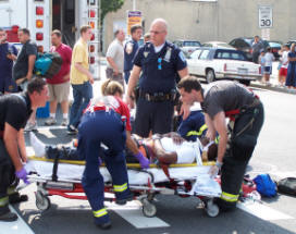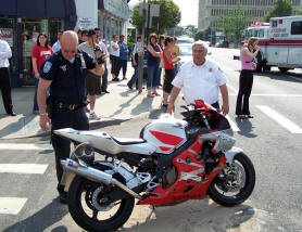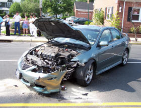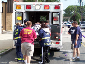 Story and Photos by Ex-Captain Steve Grogan On Friday, June 30, 2006, the Lynbrook Fire Department was dispatched at 4:16 PM to a reported accident between an auto and a motorcycle at the intersection of Merrick Road and Earle Avenue. Two people riding the motorcycle were reported to be down in the middle of the intersection. A forthwith response was requested. Lynbrook's Emergency Medical Company (EMC), Unit 425, at the time, was being dispatched to another aided case when the accident occurred. Fire Chief Keith Festa ordered 425 to respond to the accident scene instead. EMC's second ambulance, Unit 425A, was on another aided case. The East Rockaway FD was called on a mutual aid to cover the aided case that 425 was originally responding to. The Department's Extrication Team, 426-2, also responded to the accident from nearby Denton Avenue. While Firemedics stabilized both of the injured from the motorcycle, the Extrication Team mobbed up the oil and gas in the roadway. Both of the injured were placed on stretchers and transported to the hospital by 425. The driver of the car was not injured. |