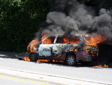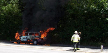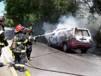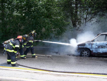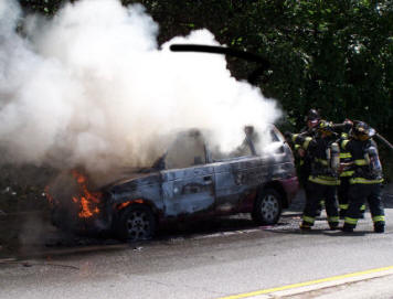 On Monday, July 24, 2006, at just after noon, FIRECOM dispatched the Lynbrook Fire Department to a reported car fire on Ocean Avenue near Peninsula Blvd. Chief Keith Festa and Deputy Chief John O'Reilly while responding to the scene could both see a large column of black smoke in the eastern section of Lynbrook. Chief Festa notified FIRECOM and responding fire units of a working car fire on Ocean Avenue just opposite Madison Street. Tally-Ho Engine 3 was the first pumper to arrive. They took the hydrant on the corner of Madison and stretched one line to the burning vehicle. Vulcan Engine 2 also responded and dropped a second backup line. Truck Company also responded and assisted. Although it only took a matter of minutes for Lynbrook firefighters to put out the fire, the vehicle was a total loss. |