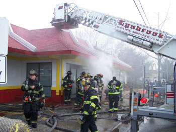With the McDonald’s store on Merrick Road to be torn down this week for a new building, the owners allowed the volunteers of the Lynbrook Fire Department to conduct a drill and training session in the empty building on Sunday morning, January 27, 2008. The LFD, under the command of Chief Robert Occhipinti, and the Department’s training committee, held a number of training evolutions inside and outside the building. Besides Lynbrook’s five fire companies, the Emergency Medical Company, and the Lynbrook Junior Fire Department, ladder companies from the East Rockaway and Rockville Centre Fire Departments, also trained. During the training the Lakeview Fire Department stood-by to cover additional fire calls in Lynbrook during the training. |