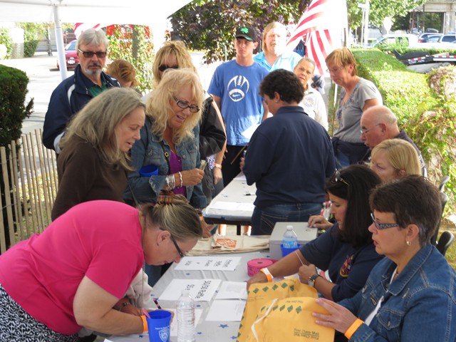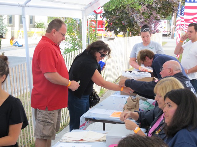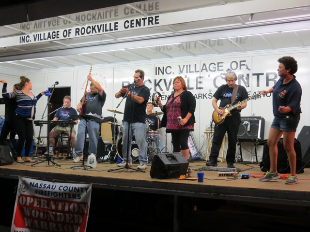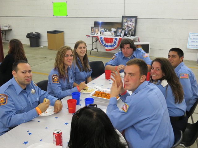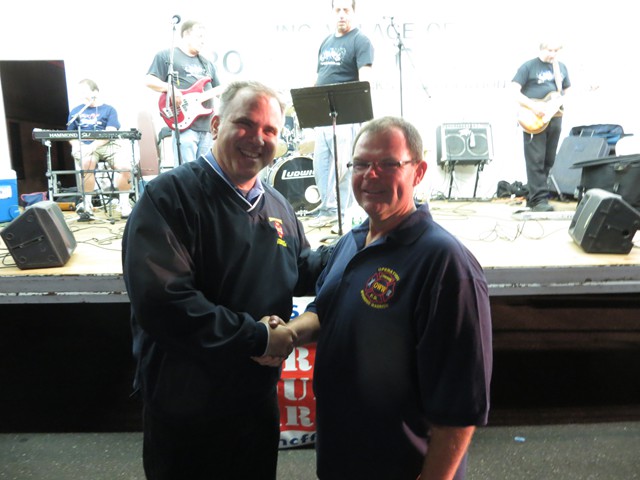 On Saturday evening, September 21, 2013, Lynbrook firefighters hosted their Third Annual Community Concert for the Troops to benefit Nassau County Firefighters Operation Wounded Warrior which the department has been actively involved for the past five years. The Concert was held at Truck Company's firehouse on Earle Avenue which was closed off to vehicular traffic. A showmobile from Rockville Centre was used to showcase two bands who donated their time and talents to help the LFD raise funds for Operation Wounded Warrior. A bagpipe band also played and entertained everyone who attended. The event was also supported by the Lynbrook Chamber of Commerce, the American Legion, Veterans of Foreign Wars, and the Marine Corp League who all gave donations. Their was also many people, businesses, and restaurants who donated gifts and raffle prizes. There was over 60 raffle prizes given out that night. Former firefighter and NYS Assemblyman Brian Curran donated $1510 from an event he held and Hempstead Town Councilman Tony Santino also donated. Lynbrook Mayor Bill Hendrick, and Trustees Alan Beach and Mike Hawkshurst were in attendance and supported the firefighters. The special guest at the concert was US Marine Corporal Marcus Dandrea who lost both legs in an IED explosion in Afghanistan in 2011. Dandrea, who is still undergoing treatment at the Walter Reed National Medical Center in Bethesda, MD, also brought with him his wife Victoria, also an active duty Marine and their newborn. They have two other children. Dandrea came to Lynbrook for last year's concert and firefighters met with Dandrea and his family at Walter Reed last December during Operation Wounded Warriors annual visit to Bethesda. Lynbrook firefighters raised just shy of $20,000 from the concert as well as from softball games the firefighters played against the Lynbrook Baptist Church and the Lynbrook Police Department.