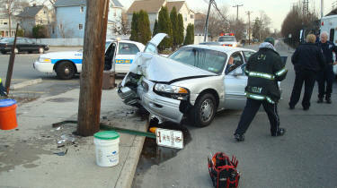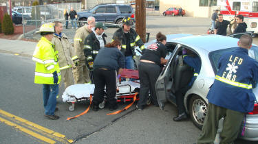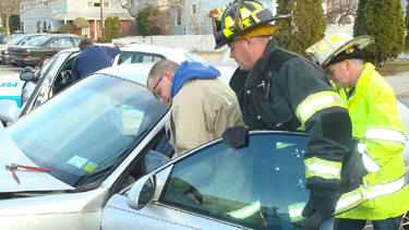 Car Crashes into Utility Pole Story & photos by Ex Captain Steven Grogan Lynbrook firefighters and medical personnel responded on Wednesday, March 16, 2011, at approximately 5:30 PM to a reported vehicle into a pole on Forest Avenue south of Sunrise Highway. The department under the command of First Deputy Chief Michael Hynes responded with the Exrication Team and the Emergency Medical Company. At the scene firefighters found the driver sitting in his vehicle suffering cuts and a hip injury. Because of the hip injury firefighters were forced to use the cutting tool to remove the driver's door so that the driver could be safely removed to a stretcher. He was then transported by the Medical Company ambulance to the hospital. |