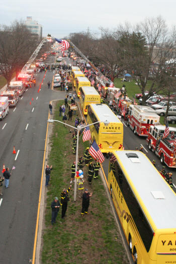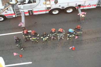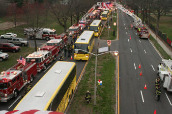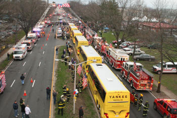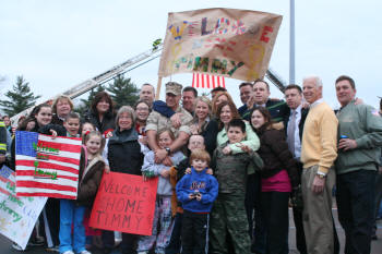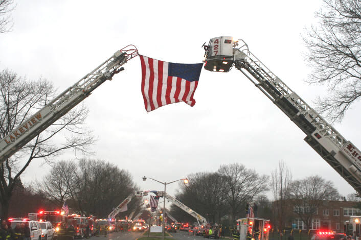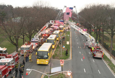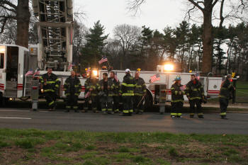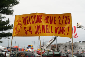 Truck Company 427, and Vulcan Company 422, along with other department members, joined with the other departments lining both sides of Stewart Avenue from Clinton Street to the training center. As the buses carrying the troops passed, firefighters saluted and waved American flags, and fire truck horns and sirens blew. Some of the pictures displayed here were taken from 427’s bucket. Truck Company joined with Lakeview’s ladder to fly one of the many American flags that the troops passed under on their return home. One of those returning Marines was Lynbrook resident, Cpl. Timothy Ledwith, a New York City firefighter, and the son of Lynbrook Village Attorney Peter Ledwith, and wife Susan. This was Ledwith’s third tour of duty in Iraq. During its most recent deployment, Ledwith and the other Marines performed counter-insurgency missions and trained Iraqi security forces. This unit fought in the Gulf War of 1990 and 1991, and again in Iraq in 2002, 2003, and for the past seven months. |