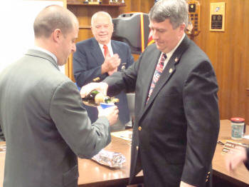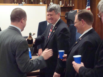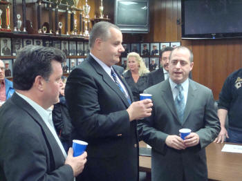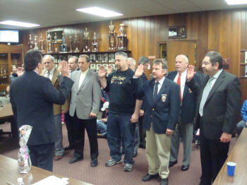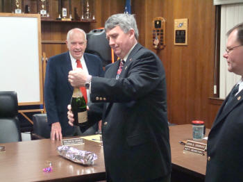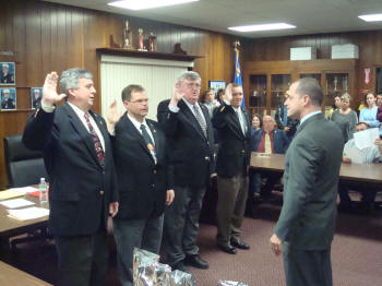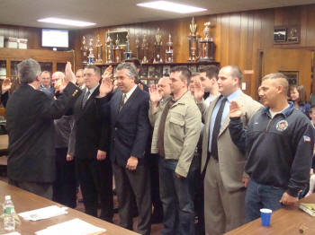 At the Council Meeting held on April 15, 2008, John O'Reilly of Engine Company was sworn in by Lynbrook Mayor Brian Curran as Chief Engineer of the Lynbrook Fire Department for the coming year. Also sworn in was First Deputy Kevin Bien of Truck Company, Second Deputy Ray Burke, of Hose Company, and Third Deputy Mike Hynes, of Engine Company. Mayor Curran then presented a bottle of champagne to Chief O'Reilly who opened it and a toast was made for a safe and successful year to the chiefs and the volunteers of the Department. After the Chiefs were sworn in, the Village Administrator John Giordano, swore in the wardens. Chief O'Reilly then swore in the officers of the six companies that make up the Lynbrook Fire Department |