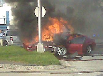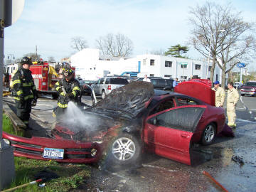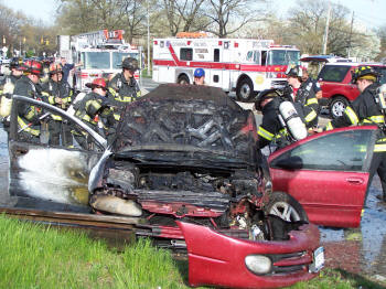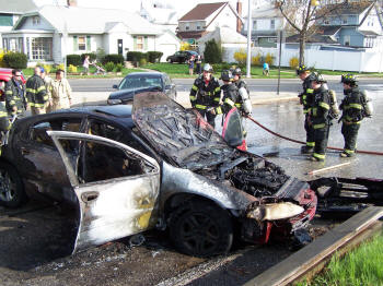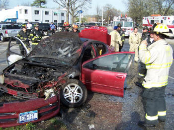 At 4:45 PM, Brown heard the sound of a collision near his home in Lynbrook. He came out of his house to see a two car accident on nearby Peninsula Blvd. As he quickly ran to the scene, one of the cars was already on fire and the driver was still inside his wrecked vehicle. Brown ran to the car and pulled on the driver’s door but found it partially pinned by the accident and blocked by the other vehicle. The windows were closed and interior of the car was filled with smoke and fire could be seen around the dashboard. Brown forced the door and then squeezed into the partial door opening. He found the driver unconscious and covered by the inflated air bag. Brown, taking much effort, was able to lift the man from his seat as the black smoke got heavier and the fire grew larger. Just as he was pulling the man from the seat and back through the narrow door opening, Lynbrook Police Officer Doug King who had responded to the accident call, came up from behind Brown and pulled them both through the door space as flames soon engulfed the passenger area. They then both carried the man away from his burning vehicle. The vehicle was fully engulfed in flames when firefighters arrived. The Lynbrook Fire Department, under the command of First Deputy Chief Ray Burke, responded to the working car fire and accident with two engines, a ladder, the department’s Extrication Team vehicle and two ambulances. A total of six people were injured in the accident. The injured driver was taken to Mercy Hospital by a Nassau County Police ambulance in serious but stable condition. The other five injured were transported to the same hospital by Lynbrook and East Rockaway Fire Department ambulances. Those five had minor injuries. |