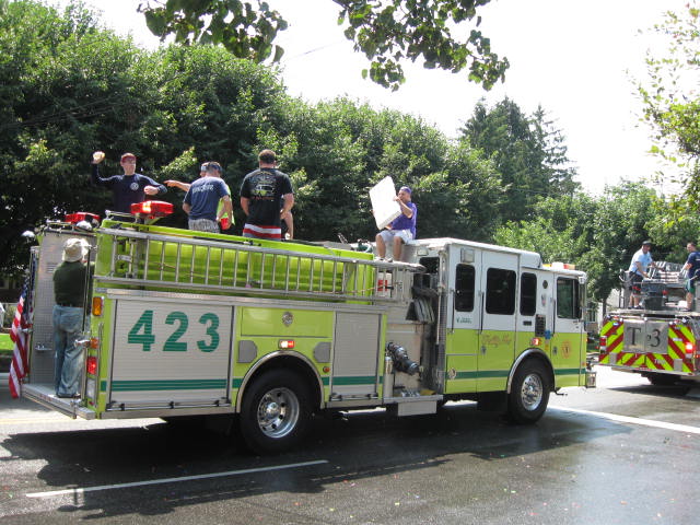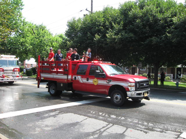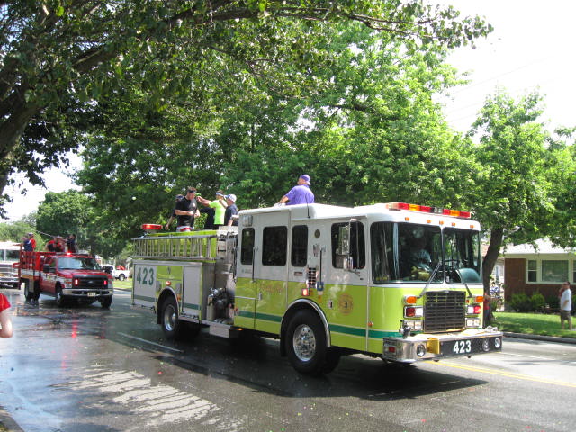 On July 4, 2012, Lynbrook Chief Anthony "Zemo" DeCarlo and a group of Lynbrook firefighters on Tally-Ho's rig and the rack truck, participated in the Fourth of July Bug Parade in Stewart Manor which attracts 35 departments in this annual water fight, along the over one mile parade route, between the firefighters and the homeowners. Chief "Zemo" said, "It was one of the craziest things I have ever done in the fire service." "It was so much fun!" Although Lynbrook firefighters came armed with water balloons and water guns they were no match for the homeowners with their garden hoses, water cannons, and their own supply of buckets of water and balloons. Everyone got wet. Stewart Manor FD then held a block party at their firehouse after the parade. |