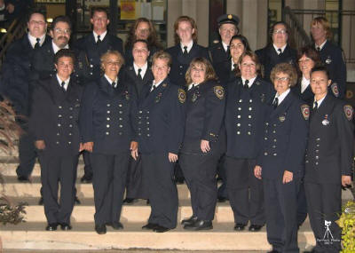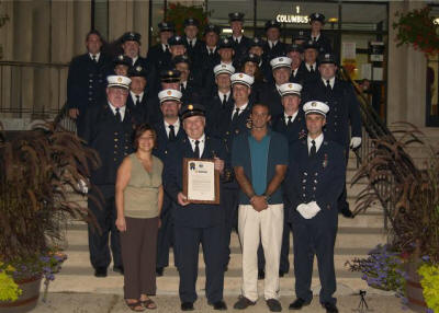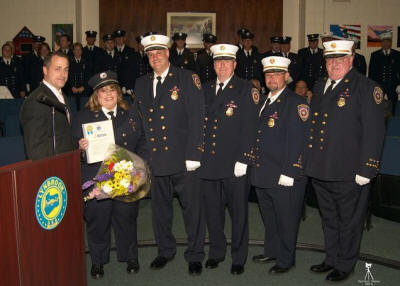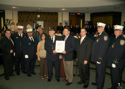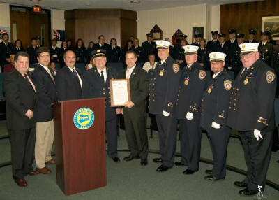 At the Lynbrook Village Board Meeting held on August 6, 2007, the Mayor and Trustees honored two Lynbrook volunteers. The Mayor first presented a Citation to Ex-Captain Cathy Aresta of the Emergency Medical Company for her heroism in assisting with the rescue of a person from a burning auto in Malverne. Secondly, Ex-Chief and Honorary Fire Commissioner Dominic DeCarlo of Tally-Ho Engine 3 was presented with a Citation recognizing his 60 years of volunteer service to the Lynbrook Fire Department and the residents of Lynbrook. Chief Robert Occhipinti, and Assistant Chiefs, John O'Reilly, Kevin Bien and Ray Burke were on hand for the presentations. After the meeting, members of the Emergency Medical Company and Tally-Ho posed with their respective honorary on the steps of Village Hall. |