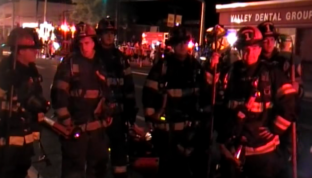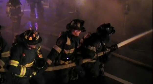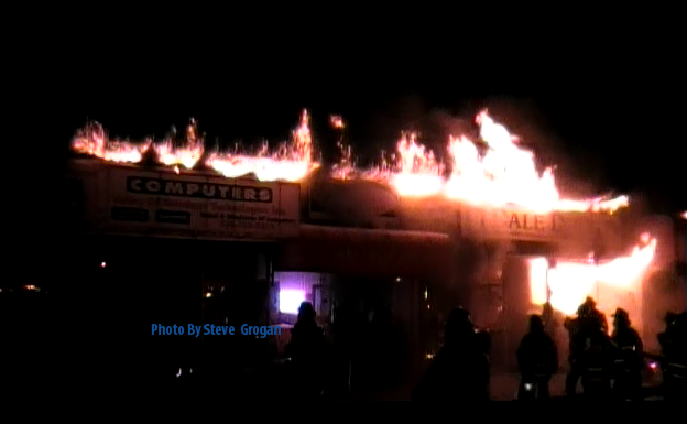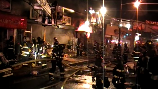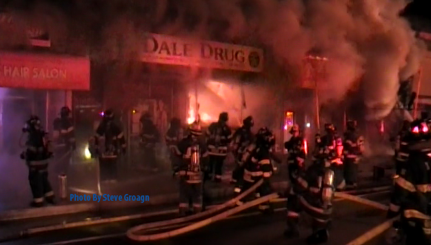 Mutual Aid to Valley Stream Story & photos from video by Ex Captain Steven Grogan August 8, 2012 the Lynbrook Fire Department was one of seven departments that responded Wednesday night to assist the Valley Stream Fire Department with a Signal 10 building fire on West Merrick Road and Shaw Avenue. Valley Stream firefighters were called out at 10:55 PM for a reported fire in a row of about 10 stores at that location. Firefighters upon their arrival found a dry cleaners fully involved and fire blowing out the front window. While lines were being stretched and units were arriving the fast moving fire moved westbound eventually spreading to three other storefronts before it was stopped. The fire moved from store to store by way of a small spaced common cockloft that stretched the block. Additional stores also received damage. Lynbrook's Emergency Medical Company was first called and responded with unit 425. Then Truck Company Unit 427 responded as a fast team. Both First Assistant Chief Edward Hynes and Third Assistant Chief James McDermott were at the scene. The Medical Company transported one Valley Stream firefighter to the hospital. Lynbrook firefighters were at the scene for about three hours. |