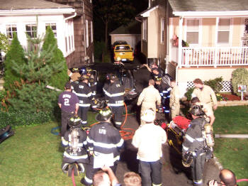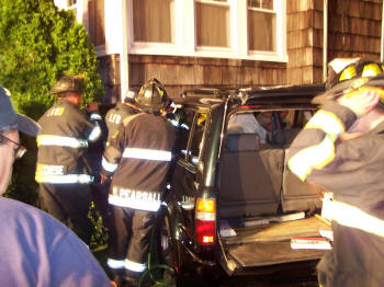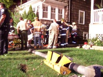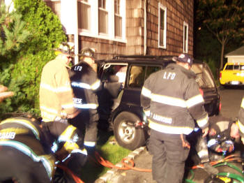 On September 10, 2008, the Lynbrook Fire Department, under the command of Chief John O'Reilly, responded to a reported "Car into a house," with a forthwith response, at the intersection of Peninsula Blvd and Lyon Place. The Department's Extrication Team and the Emergency Medical Company was dispatched to the scene. Additionally, Engine Company 1 was also requested to the scene by Chief O'Reilly upon his arrival. The Extrication Team using the spreaders and cutters removed both doors on the driver's side and the "B" post to remove the driver from the vehicle which was nearly half-way into the house. The Department was assisted by Nassau County Police Ambulance Bureau members who were also on the scene and stabilized the driver while Lynbrook members extricated the driver. Extrication members, along with employees of the Lynbrook Building Department, inspected the house, and determined that no structural damage was done. Nassau County transported the driver to the hospital. According to the Lynbrook police the driver was arrested on DWI charges. |
