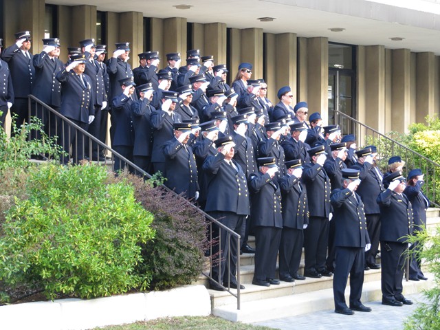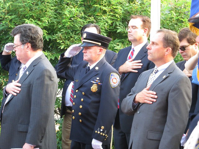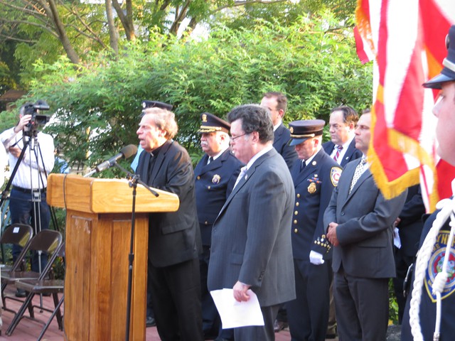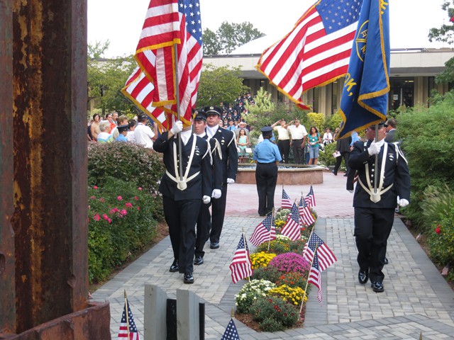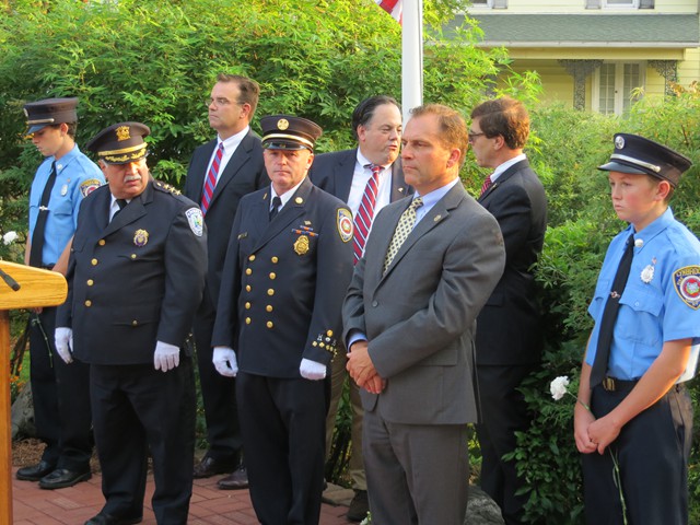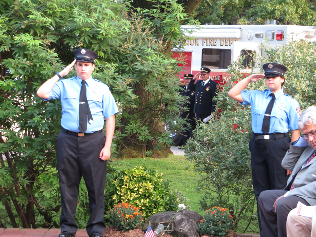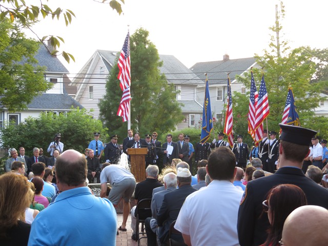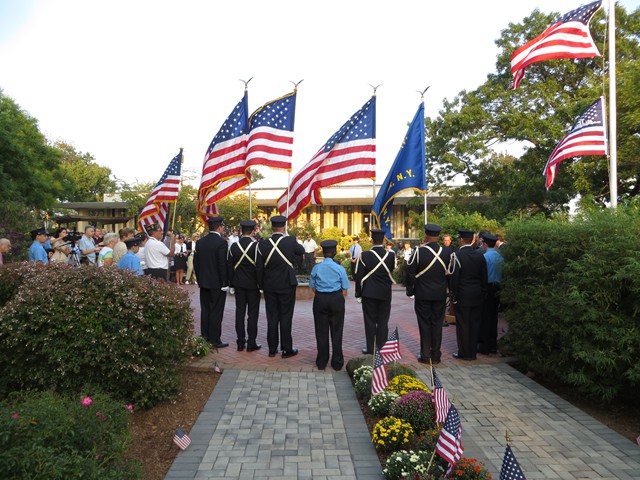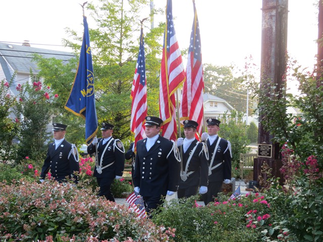 On the twelve anniversary of the terrorist attacks on the United States, Lynbrook Fire Chief Edward J. Hynes led the members of the Lynbrook Fire Department, the Ladies Auxiliary, and the Junior Fire Department, at the Village of Lynbrook's annual memorial service that remembers those from the community who perished in the World Trade Center. The department's Color Guard brought in the colors while the Junior firefighters assisted by presenting carnations to the families to place on the stone marker of their relative.