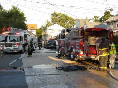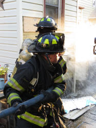 The other arriving fire units stood-by. Engine Company's hose line was used to wet down the outside wood framed walls underneath the siding. The inside of the house was also checked to make sure the fire had no spread into the inside walls. Damage was contained to the outside. |