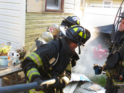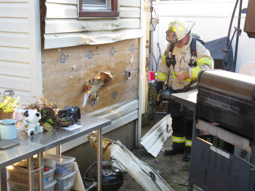 The first arriving firefighters found a burning gas barbecue which was too close to the back of the house and had melted and burned the siding. Engine Company was first on the scene and stretched a line to the rear of the house. Truck Company also arrived and assisted in removing the melted siding from the house.