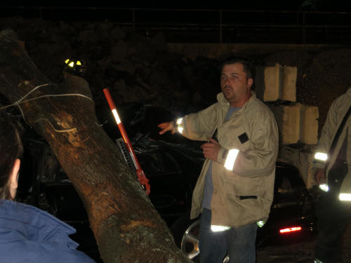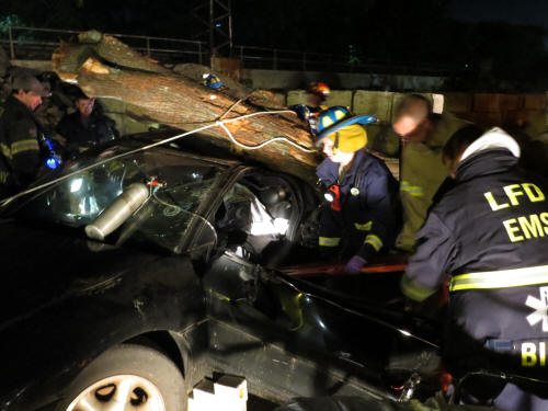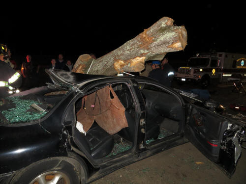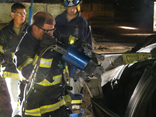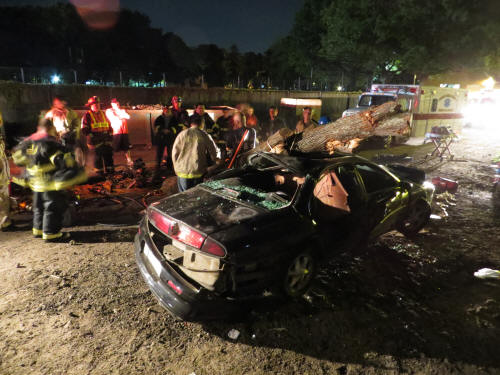 Extrication Training Story & photos by Ex Captain Steven Grogan On Monday, September 24, 2012, the Training Committee of the Lynbrook Fire Department conducted a Extrication training session with the Extrication Team and the Emergency Medical Company at the department's Training Center in Wilcox Alley. The Extrication Team and Medical Company responded to Wilcox Alley and found a crushed vehicle which had a tree across the top of it. (The Village of Lynbrook's Department of Public Works assisted and put the tree on the vehicle). When the firefighters and Medical personnel arrived on the scene they found three dummys representing victims trapped inside the crushed vehicle. The Medical Company personnel went to work and attended to the so-called victims while the Extrication Team worked to remove doors with their tools to get the trapped victims out of the vehicle. The training session was put together by department training officers Brian Brown, Nick Pearsall, and John Chavatte. |