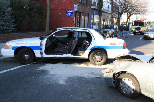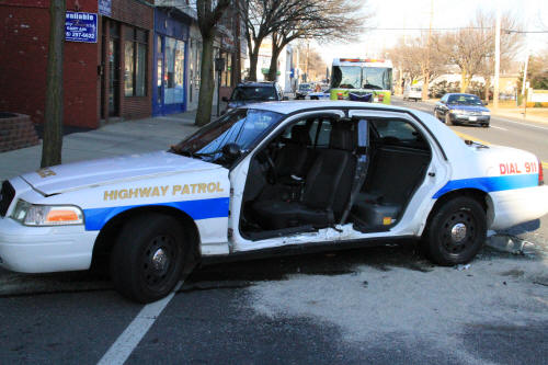 A Lynbrook police officer trapped in his police vehicle after an auto accident on Monday morning had to be cut out of the wrecked vehicle by Lynbrook firefighters. At about 8 AM Monday, the police officer was involved in a collision with another vehicle on Merrick Road in front of North Middle School. The Lynbrook Fire Department's Emergency Medical Company, the Extrication Team, and Tally-Ho Engine 3, all responded to the scene under the command of First Assistant Chief Anthony DeCarlo. Firefighters had to cut off both driver and rear doors to remove the injured officer and get him on a stretcher. The driver of the other car was also injured and also placed on a stretcher. Both were transported to the hospital by the Emergency Medical Company. Neither were injured seriously. Merrick Road was closed for over an hour. |