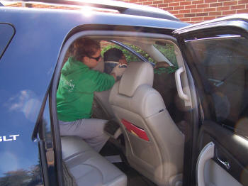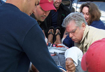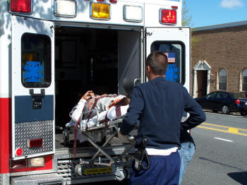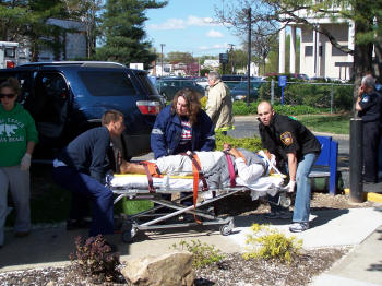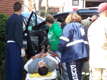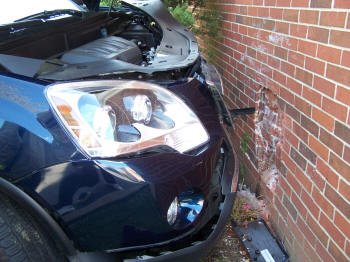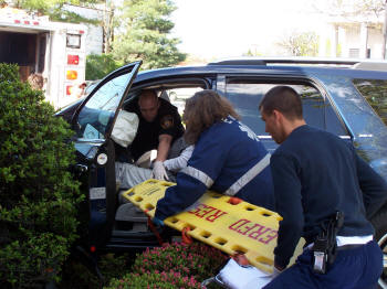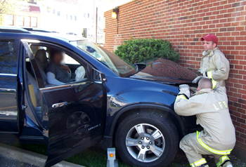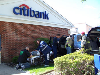 On Monday morning a motorist, allegedly cutoff by another driver, drove into the drive-in driveway of Citibank on the corner of Merrick Road and Broadway and slammed into the bank building. Luckily the airbags deployed and she was saved from serious injury. The Lynbrook Fire Department's Extrication Team responded to the scene as did an ambulance from the East Rockaway Fire Department as Lynbrook's Medical Company was handling two other aided cases at the time. East Rockaway firefighters are shown her stabilizing the driver and transporting her to the hospital. Some structural damage was done to the building and the Village of Lynbrook's Building Superintendent responded to the scene. |