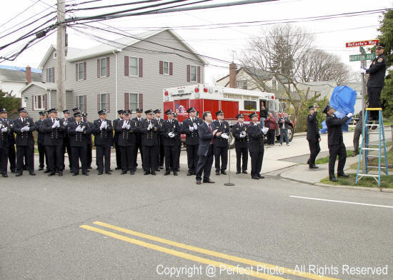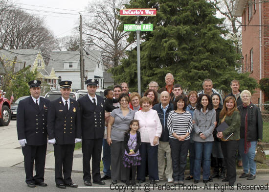 On Sunday, March 25, 2012, the Village of Lynbrook officially re-named Horton Avenue in honor of Ex-Chief and Honorary Commissioner Dominick J. DeCarlo, Jr., a 65 year member of Tally-Ho. Present for the ceremonies, held before Tally-Ho's 100th Anniversary celebration, were the members of Tally-Ho, Uncle Dom's two children, Lisa, and Dominick Jr., the DeCarlo family, village, state, and county officials, along with members of the department, and friends. First Assistant Chief Anthony DeCarlo, Uncle Dom's nephew, uncovered the new sign which sits atop the street sign post opposite the firehouse. Signs are also affixed to the street signs at Merrick and Horton and Sunrise and Horton. |