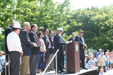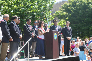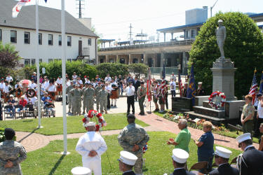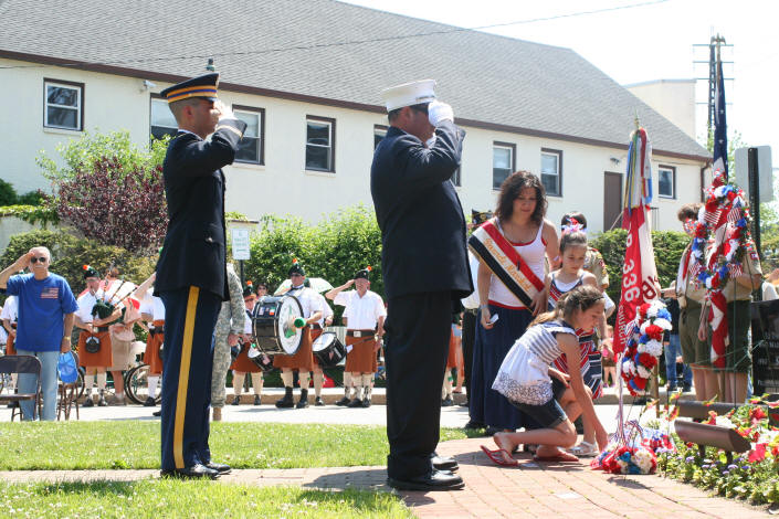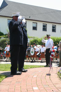 Story & photos by Ex Captain Steven Grogan After the completion of the Memorial Day Parade Chief Raymond Burke and the other chiefs joined with the members of Tally-Ho Engine 3, along with Engine 2, VSFD, Tally-Ho's sister company, as the VFW honored Tally-Ho Ex-Captain Jeffrey L. Wiener who was killed in action in Iraq five years ago on May 7, 2005. During the ceremonies honoring Jeff, Captain Dominick Gerardi spoke about Jeff's time with Tally-Ho and the supreme sacrifice he made as a Navy corpsman. Additionally, Maria Wiener, Jeff's widow, who was the parade Grand Marshal, also spoke about her husband. Maria and her two girls placed flowers on Jeff's stone in front of Village of Lynbrook's Doughboy Monument. |