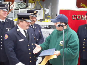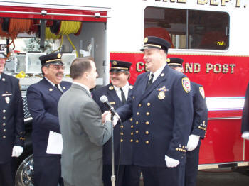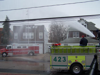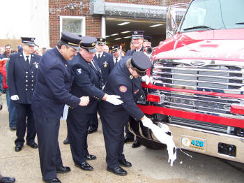 On Sunday, December 9, 2007, the Floodlight Unit of the Lynbrook Fire Department held a wet down and christening of their new 2007 Marion Motor Works built Floodlight Command vehicle which is on a Sterling chassis. The truck went into service on November 11th. First Lieutenant and Ex-Chief James Hillgardner introduced the officers, chiefs, the truck committee, as well as the mayor and village trustee, Chaplain Father Breslowski, and Assemblyman Bob Barra, who were all on hand for the dedication. Father Bill sprinkled holy water on the vehicle and Captain and Ex-Chief Robert Cribbin, with the assistance of First Lt Hillgardner and Second Lt and Ex-Chief John Matzen, broke the ceremonial bottle of champagne on the front bumper of the truck. In addition, Mayor Brian Curran, a firefighter, and Deputy Mayor Bill Hendrick, the fire department liaison, spoke briefly as did Chief Robert Occhipinti, who symbolically turned over the keys to the new truck to Captain Cribbin. Assemblyman Barra presented a Citation to the Unit. Tally-Ho Engine 3 then turned on its deck gun and wet down the new truck. A collation followed in Engine Company 1’s firehouse. |