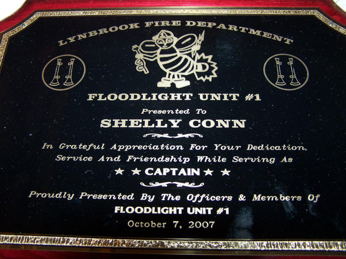 On Sunday, October 7, 2007, the Lynbrook Fire Department's Floodlight Unit #1 held their Annual Dinner and honored Ex-Captain Shelly Conn of Vulcan Company. The dinner, chaired by Ex-Chiefs Anthony Badolato and Frank Abrams, was held at the East Rockaway Yacht Club. Present Captain Robert Cribbin, with First Lieutenant James Hillgardner and Second Lieutenant John Matzen, presented Shelly with a plaque for his service and dedication as the past Captain of the Unit.
