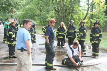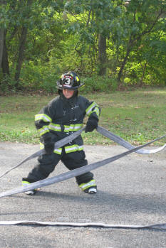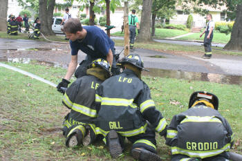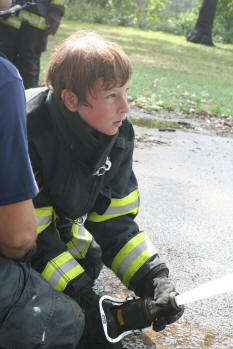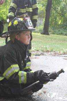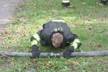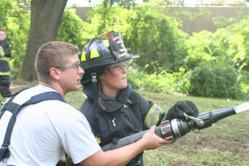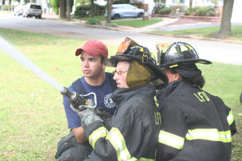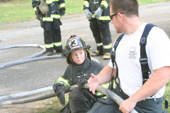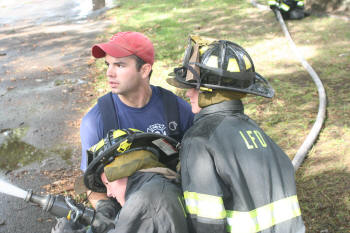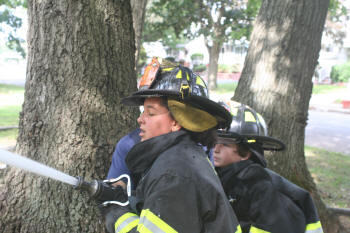 Story & photos by Ex Captain Steven Grogan On Sunday, September 26, 2010, members of the Lynbrook Junior Fire Department, in grown-up turnout gear too big for most of them, received hose attack training from members of Tally-Ho Engine 3 at Valley Stream's training area on Saterie Avenue and Horton Avenue. The juniors trained with charged inch and 3/4 attack lines, even moving the lines around obstacles. They learned to work as a team as each took turns as the nozzle man. The juniors were also assisted by three of their advisors (and former juniors themselves), Ex-Chief John O'Reilly, and Firefighters Chris Hynes of Engine and Brian Grogan of Tally-Ho. The juniors train with each of the six companies in the Lynbrook Fire Department as part of their learning experience to be a future Lynbrook firefighter. |