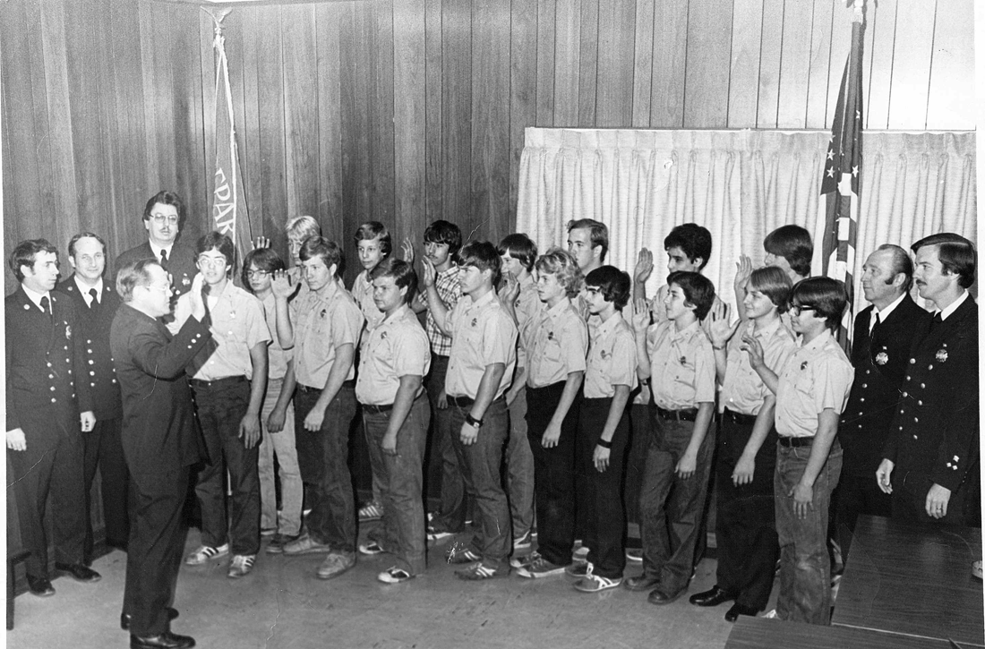 In 2014, the Lynbrook Junior Fire Department is celebrating its 35th Anniversary. In the above photo, then Chief Robert Forte swears in the first members of the newly formed Lynbrook Junior Fire Department in July 1979. The photo was taken by John Cribbin. Can you identify some of the youngsters? |