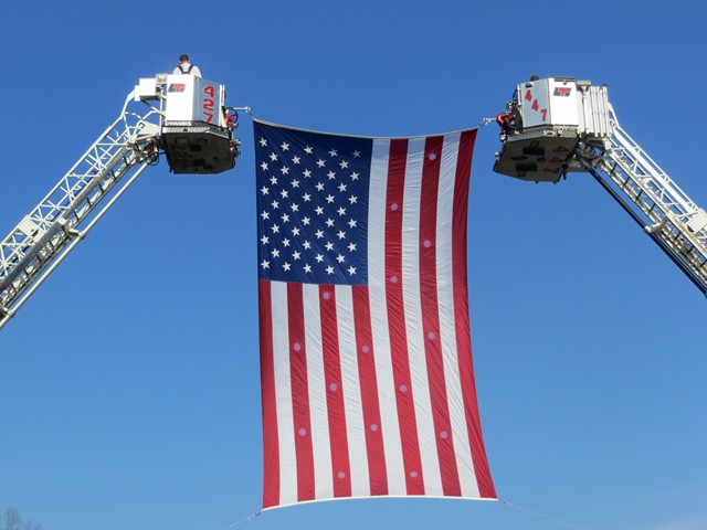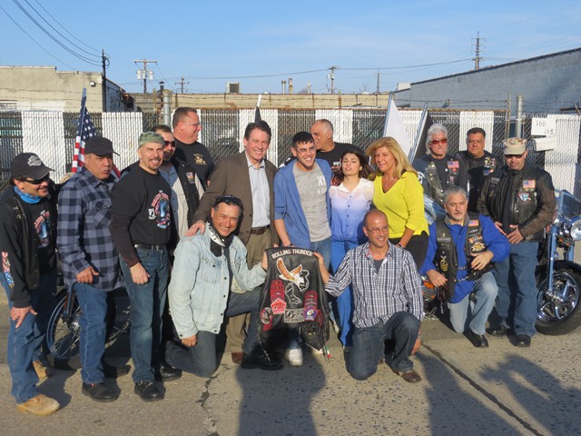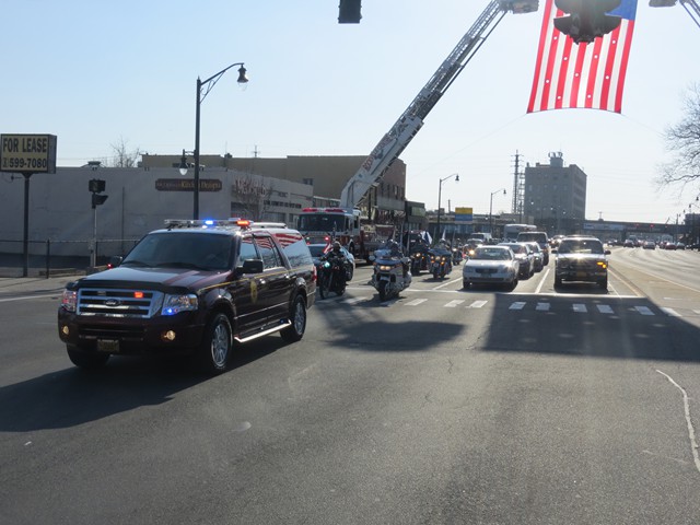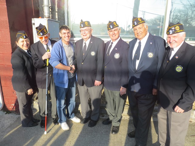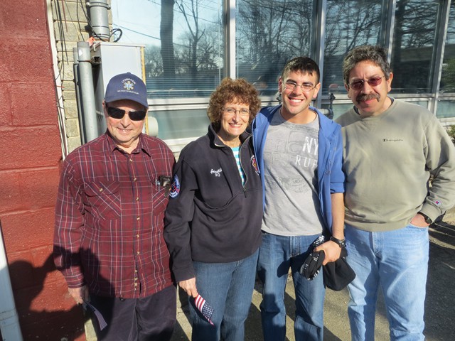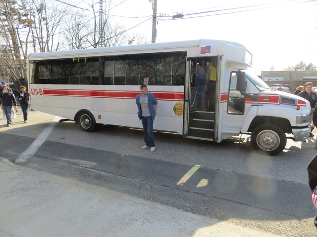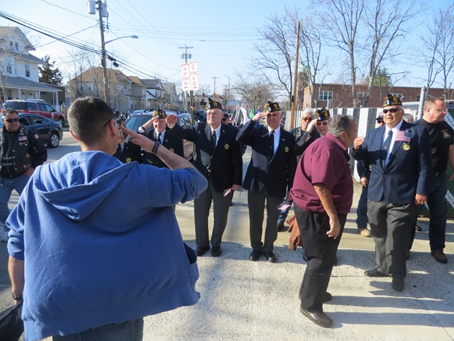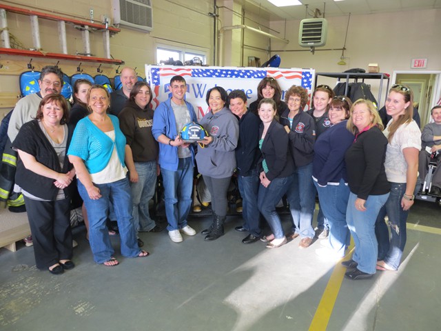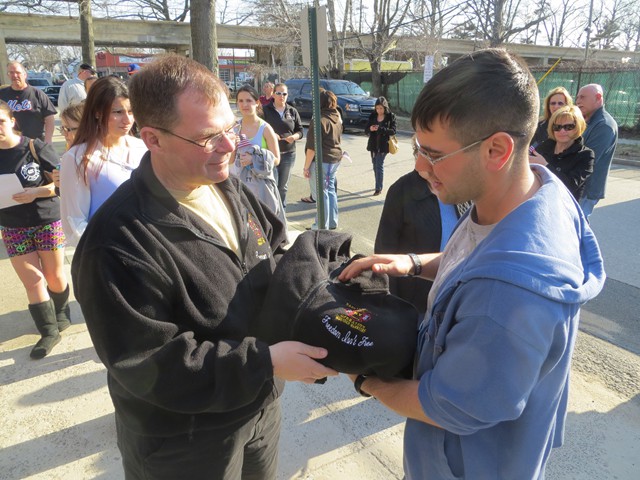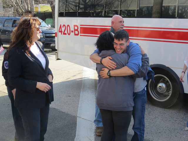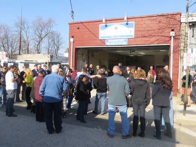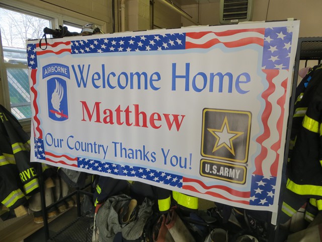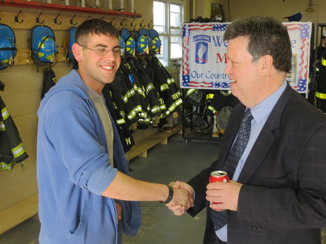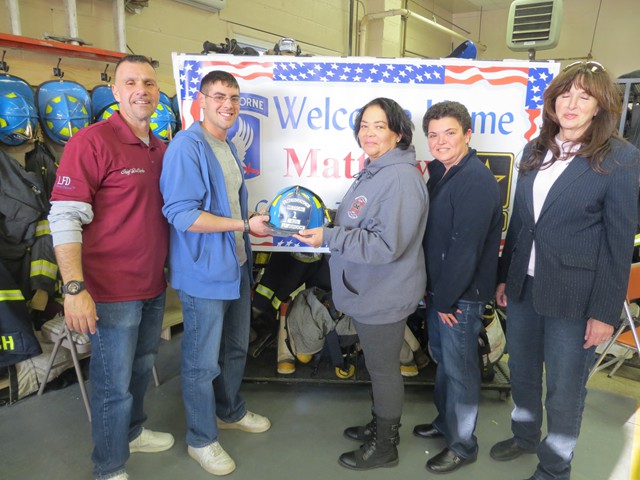 On Friday afternoon, April 5th, US Army Paratrooper Matthew Khattab came home to Lynbrook and was greeted by a crowd of EMT's, firefighters, veterans, family and friends, as he stepped off the Lynbrook Fire Department bus in front of the Emergency Medical Company, MEDCO, on Vincent Avenue where Matt has been an EMT since 2008. The Lynbrook Fire Department, led by Chief Anthony DeCarlo, picked Matt up at JFK Airport. The procession from the airport to Lynbrook was led by the fire chief's car with a special escort provided by Patriot Riders' motorcycles from Staten Island. As they drove on Sunrise Highway in Lynbrook the procession passed under a huge American flag hanging between fire department ladder trucks from Lynbrook's Truck Company and Rockville Centre's Eureka Company. Matt, an airborne infantryman, joined the US Army in 2010, and is assigned to the 173rd Airborne Combat Team out of Vicenza, Italy. In June 2012, Matt was sent to Afghanistan where on August 2nd his unit was ambushed by attacking insurgents who launched three RPG's (rocket propelled grenades) at his unit while out on patrol. One of the those grenades landed next to Matt and exploded showering him with shrapnel. The shrapnel tore into his arm, but luckily the body armor he was wearing absorbed the rest of the exploding shrapnel. The body armor saved his life. Matt was offered time out of the area to recuperate and heal his wounds but he refused and stayed with his unit. He remained on duty with his arm wrapped in bandages. He was later awarded the Purple Heart. When Matt got off the bus in front of the firehouse on Friday the well-wishes included a group of veterans from Lynbrook's American Legion who saluted the returning soldier and each shook his hand thanking him for his service. Lynbrook Mayor William Hendrick was present as was Nassau County Legislator Fran Becker. The members of MEDCO, who had put signs on the firehouse welcoming Matt home, put out a collation of food and beverage for everyone to enjoy. They also gave Matt back his old EMT helmet. Additionally, Matt was presented with a fleece jacket from Nassau County Firefighters Operation Wounded Warrior, an organization that helps wounded warriors and which the Lynbrook Fire Department is actively involved. It was really so nice seeing everyone that day and I thank everyone for coming," said Matt. "It was so good to see him home," said Chief DeCarlo. "Everyone in Lynbrook appreciates Matt's service as an EMT and as a member of this fire department, but now everyone should especially appreciate his service to our country. Let me say on behalf of the Lynbrook Fire Department, thank you, Matt." Matt will be home on leave for 30 days and then return to his unit in Italy. He has seven months left in his military service.