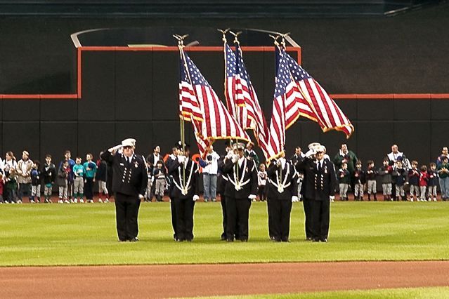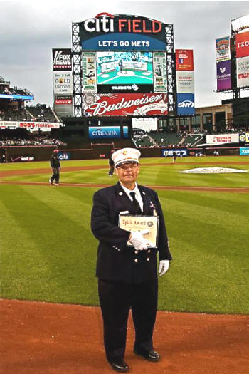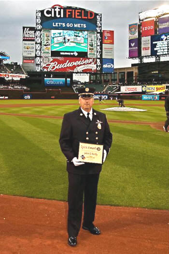 Each year the Mets organization in cooperation with the Lynbrook Little League holds Lynbrook Community Night at the stadium. This year, on May 26th, at the new Citi Field, and as in past years, the Lynbrook Fire Department color guard marched out into the outfield to present the colors for the singing of the National Anthem. During the opening ceremonies the youngsters and their coaches from each of the Lynbrook Little League teams lined the warning track on the field. A large group of Lynbrook volunteers were in the stands to watch the festivities. Also during the ceremonies a number of Lynbrook residents were honored with the 2009 Spirit Award, including Ex-Chief John O'Reilly. Lynbrook Chief Kevin A. Bien was on hand for the presentation. The Mets won the game. |