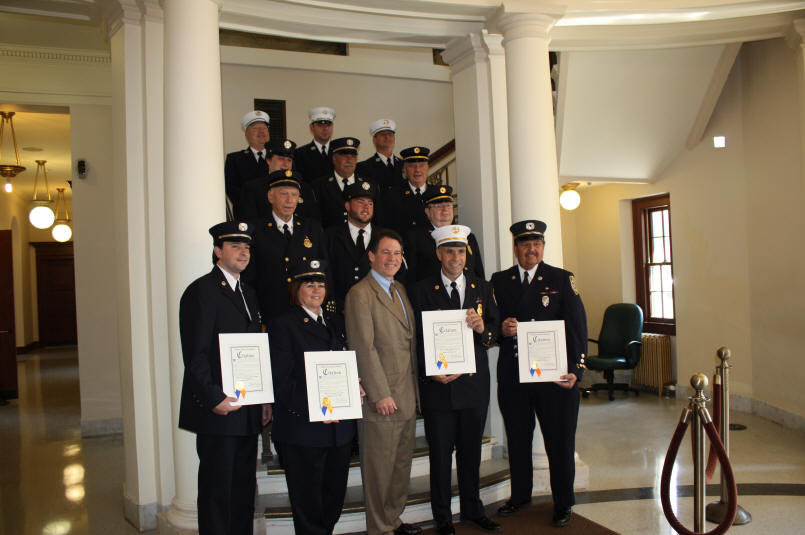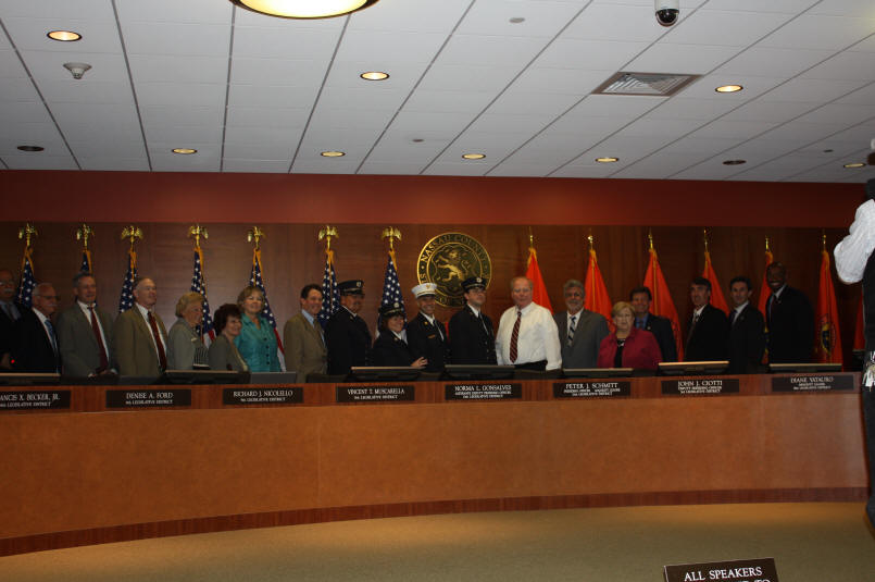 On June 6, 2011, Legislature Fran Becker honored Lynbrook FD First Assistant Chief Anthony DeCarlo, of Tally-Ho Engine 3, Ex-Captain Cathy Bien, Emergency Medical Company, Ex-Captain Clayton Murphy, Vulcan Company 2, and Ex-Captain Richard Straub, also of Vulcan Company, for their efforts in saving the life of a child. The four were honored by Becker and the whole Nassau County Legislature for saving the life of a 2 and 1/2 year old who fell into a friend's backyard pool in Lynbrook on April 13, 2011. The firefighters, upon arrival at the home, found the child lifeless, cold, and not breathing. They revived the child and then all four jumped into the Chief's car and raced the child to the hospital. The child fully recovered. |
