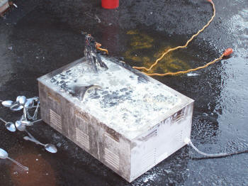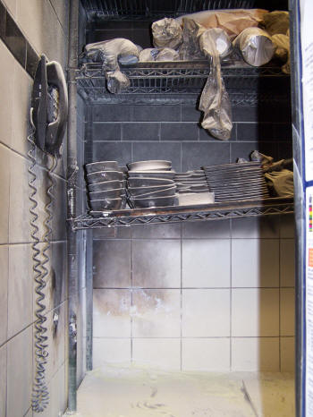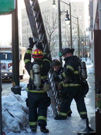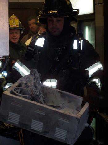 Meanwhile, Engine Company from up the block arrived on the scene and dropped a line at the rear door and took the hydrant across the street. Truck Company took the front of the building and put a ladder to the roof. Other arriving companies stood by. Firefighters carried the burnt out warmer outside and watered it down with the hose line. The kitchen area and the ceiling area near the fire were checked and determined that the fire had not extended beyond that immediate area. The department was under the command of Chief Kevin Bien. No explanation was given why the burglar alarm sounded and not the fire alarm. The department was at the scene for about 20 minutes. |