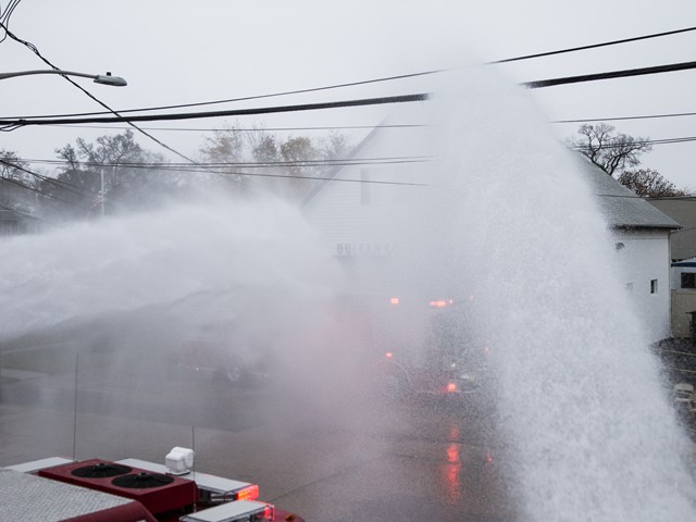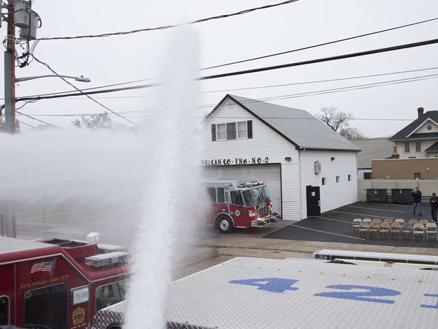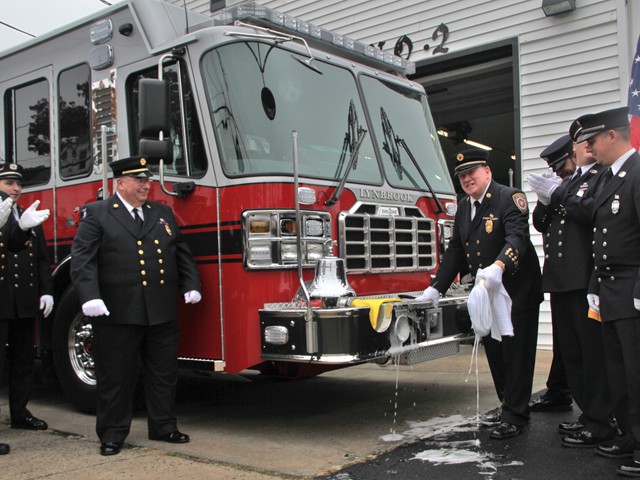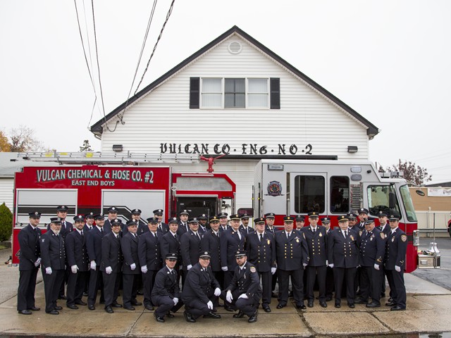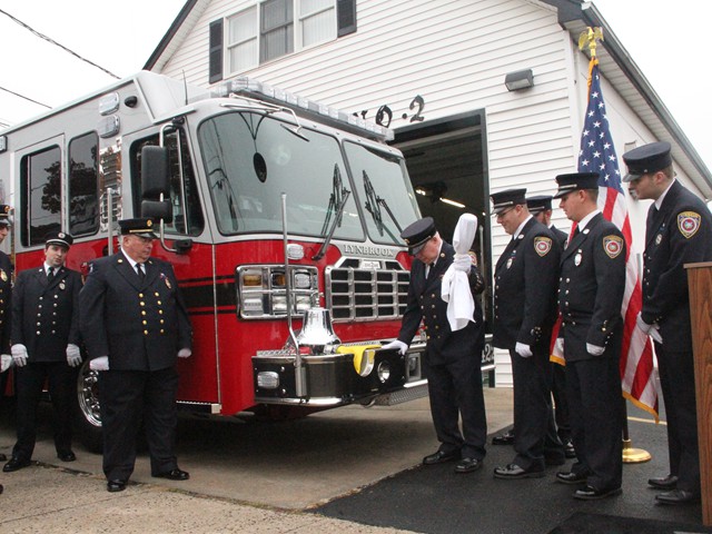 On Sunday, November 17, 2013, the members of Vulcan Company 2 christened their new 2013 Inferno 74" custom chassis 1500 gallon pumper built by Ferrara Fire Apparatus at ceremonies and a wet down in front of their fire house on Denton Avenue. On hand for the ceremonies was Ex-Chief Fred Senti Sr of the Lakeview FD who presented a Citation from Nassau County Executive Ed Mangano and Ex-Chief Chris Sheldon of the East Rockaway FD who presented a Citation on behalf of Senior Town Councilman Anthony Santino. Lynbrook Mayor William Hendrick also said a few words during the ceremony and later, Assemblyman Brian Curran stopped-by to congratulate the members. During the ceremony, Honorary Chief Charlie Weiler, after a few tries, broke a bottle of champagne on the front bumper of the new engine. Monsignor Bill Breslowski of Our Lady of Peace, and a department chaplain, also blessed the engine. |