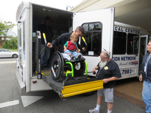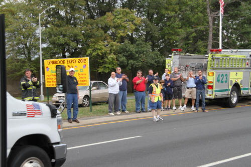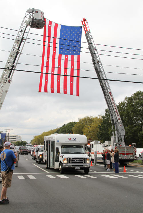 On Saturday, a procession of Lynbrook Police and fire department vehicles led the DAV bus under a flag arch made by Lynbrook's two ladders at the intersection of Sunrise Highway and Horton Avenue. Other Lynbrook fire companies and firefighters stood along the roadway and clapped as the bus drove by. The engines got in line behind the bus and followed them to the Holiday Inn Express at Ocean Avenue. The Marine and his family were staying at the Holiday Inn for the weekend compliments of the owners of the hotel.