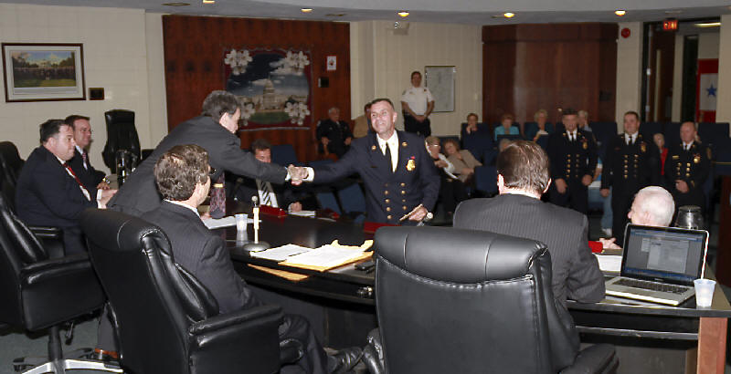 At the televised Lynbrook Village Board meeting held on Monday, April 16, 2012, outgoing Lynbrook Fire Department Chief Michael Hynes, introduced to the mayor and village trustees, as well as Lynbrook residents, the incoming Chief of Department Anthony "Zemo" DeCarlo, of Tally-Ho Engine 3; First Assistant Chief Edward Hynes, of Engine Company 1; Second Assistant Chief Michael Anderson, of Truck Company; and Third Assistant Chief James McDermott of Truck Company. The mayor will swear the chief's into office at the fire department's council meeting on the evening of April 17, 2012. |